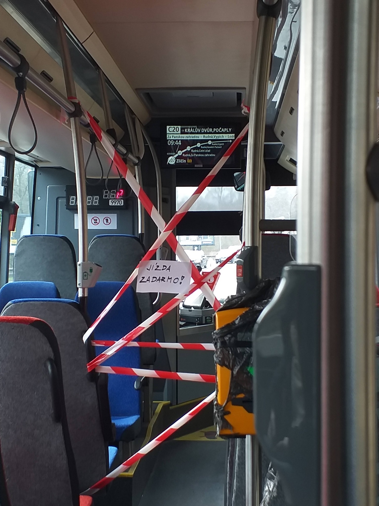 Ale to nebylo všechno poučení toho dne. Když jsem konečně odbavil své zdravotní záležitosti v Praze, počkal jsem na autobus, který mě konečně odveze z toho hotspotu infekce (a nelidskosti). Autobus přijel, ale místo předních dveří, kde se u řidiče kupovaly jízdenky, otevřel naopak dveře zadní. Přístup řidiči byl zapáskovaný a ručně psané ceduli stačila dvě slova, aby toho řekla hodně… (fotku přikládám)